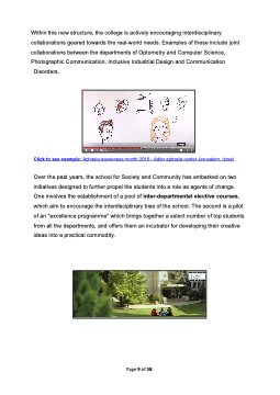 Within this new structure, the college is actively encouraging interdisciplinary collaborations geared towards the real-world needs. Examples of these include joint collaborations between the departments of Optometry and Computer Science, Photographic Communication, Inclusive Industrial Design and Communication Disorders. Click to see example: Aphasia awareness month 2016 - Adler aphasia center Jerusalem, Israel Over the past years, the school for Society and Community has embarked on two initiatives designed to further propel the students into a role as agents of change. One involves the establishment of a pool of inter-departmental elective courses, which aim to encourage the interdisciplinary bias of the school. The second is a pilot of an "excellence programme" which brings together a select number of top students from all the departments, and offers them an incubator for developing their creative ideas into a practical commodity. Page 9 of 58