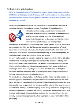 1.3 Project aims and objectives What is the desired result of implementing creative leadership programme in the HEI? What is the impact for students and staff, for university, for creative sectors, for other sectors, and for Israel in general? What kind of indicators could be used to assess the impact? Implementing Creative Leadership into the higher education roadmap constitutes a milestone change in the academic concept. A seminal shift in emphasis from information and knowledge towards implementation and application of skills and empiric knowledge to the benefit of the workforce and the national economy. A realization that academia and industry are co-dependent and that the modern business world is multi-faceted and interdependent. Furthermore, as studies throughout Europe have shown, there is a gradual but growing acknowledgement of the fact that the arts and humanities are more than a "nice to have" facet of our life and culture, but that they have much to offer to the "real world" due to their often-different approaches to problem solving, to conflict management, to motivation, to workplace, environment, people and so forth. As such, implementation of a creative leadership programme into the Higher Education roadmap must eventually impact upon all elements of the education / industry map, bringing both sides closer to each other. The addition of creative leadership modules into the arts, humanities and sciences can open-up new study areas, curricula and internships. These should hopefully lead to a more direct influence of the higher education sector on the applied fields of sociology and anthropology, commerce and industry, consumerism and the national economy. Obviously, this is not going to be a swift change and the effects may take decades to become apparent. Nevertheless, in a political environment where decisions are often taken with the short-term benefits forefront (the lifespan of a political coalition), the long- term benefits must be given their due relevance and the national vision must overcome local interests. If change on a national policy level is a long-term dream, change through the empiric channels of commerce and industry may present a more practical rout. This is where the Hadassah Academic College is aiming. Our current and future ties with industry, commercial companies and cultural organizations are a manifestation of this philosophy. Page 10 of 58