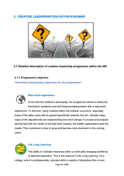 2. CREATIVE LEADERSHIP EDUCATION ROADMAP 2.1 Detailed description of creative leadership programme within the HEI 2.1.1 Programme’s objective Theoretical and practical objectives for the programme? Real world experience In line with the institute’s philosophy, the programme strives to blend the theoretical, academic and skill based professionalism with a real-world experience. To this end, many modules within the institute curriculum, especially those of the latter years will be geared specifically towards this aim. Already today, many of the departments are implementing this mind change in courses and projects directly tied with the needs of the high-tech industry, the health organizations and the media. This momentum is due to grow and become more dominant in the coming years. Life Long Learning The ability to maintain relevance within a continually changing workforce is deemed imperative. This is the essence if Life Long Learning. As a college, which is professionally, oriented within a variety of disciplines this is even Page 11 of 58