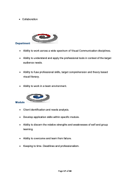 • Collaboration Department • Ability to work across a wide spectrum of Visual Communication disciplines. • Ability to understand and apply the professional tools in context of the target audience needs. • Ability to fuse professional skills, target comprehension and theory based visual literacy. • Ability to work in a team environment. Module • Client identification and needs analysis. • Develop application skills within specific module. • Ability to discern the relative strengths and weaknesses of self and group learning. • Ability to overcome and learn from failure. • Keeping to time. Deadlines and professionalism. Page 17 of 58