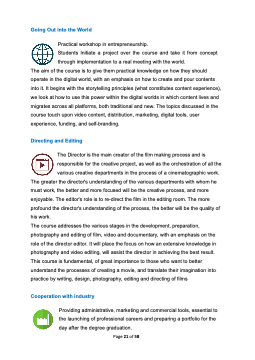 Going Out into the World Practical workshop in entrepreneurship. Students Initiate a project over the course and take it from concept through implementation to a real meeting with the world. The aim of the course is to give them practical knowledge on how they should operate in the digital world, with an emphasis on how to create and pour contents into it. It begins with the storytelling principles (what constitutes content experience), we look at how to use this power within the digital worlds in which content lives and migrates across all platforms, both traditional and new. The topics discussed in the course touch upon video content, distribution, marketing, digital tools, user experience, funding, and self-branding. Directing and Editing The Director is the main creator of the film making process and is responsible for the creative project, as well as the orchestration of all the various creative departments in the process of a cinematographic work. The greater the director's understanding of the various departments with whom he must work, the better and more focused will be the creative process, and more enjoyable. The editor's role is to re-direct the film in the editing room. The more profound the director's understanding of the process, the better will be the quality of his work. The course addresses the various stages in the development, preparation, photography and editing of film, video and documentary, with an emphasis on the role of the director editor. It will place the focus on how an extensive knowledge in photography and video editing, will assist the director in achieving the best result. This course is fundamental, of great importance to those who want to better understand the processes of creating a movie, and translate their imagination into practice by writing, design, photography, editing and directing of films Cooperation with industry Providing administrative, marketing and commercial tools, essential to the launching of professional careers and preparing a portfolio for the day after the degree graduation. Page 21 of 58