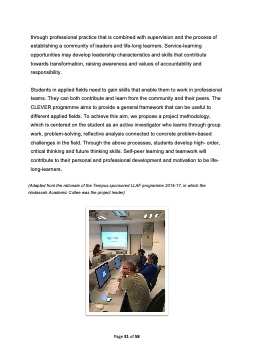 through professional practice that is combined with supervision and the process of establishing a community of leaders and life-long learners. Service-learning opportunities may develop leadership characteristics and skills that contribute towards transformation, raising awareness and values of accountability and responsibility. Students in applied fields need to gain skills that enable them to work in professional teams. They can both contribute and learn from the community and their peers. The CLEVER programme aims to provide a general framework that can be useful to different applied fields. To achieve this aim, we propose a project methodology, which is centered on the student as an active investigator who learns through group work, problem-solving, reflective analysis connected to concrete problem-based challenges in the field. Through the above processes, students develop high- order, critical thinking and future thinking skills. Self-peer learning and teamwork will contribute to their personal and professional development and motivation to be life- long-learners. (Adapted from the rationale of the Tempus sponsored LLAF programme 2014-17, in which the Hadassah Academic Collee was the project leader) Page 31 of 58
