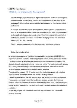 2.2.2 Main target group Who is the key target group for the programme? The interdisciplinary fields of visual, digital and interactive media are evolving at a bewildering rate. Subsequently, many practicing professionals and even recent graduates find themselves rapidly outdated and outpaced by the changes in their professions. In line with the CLEVER vision, the department of Photographic Communication sees as an integral part of its mission the necessity to offer paths of development and upgrading to these audiences, to extend their knowledge and to update their professional practice to meet the needs of the changing media. This is the true meaning of Life Long Learning. The LLL programmes practiced by the department include the following: Going Out into the World As a direct consequence of the LLL and sustainability workshops at CLEVER, the department devised a creative leadership program named “Going out into the World”. This program aims at promoting the leadership and entrepreneurial qualities of the students through activities directed at the general public. The students (usually groups of 2-4 each) were encouraged to locate areas of weakness, difficulties or lack of facilities in target audiences and develop creative solutions. Throughout the program (14-16 weeks each), the students engaged with a defined target audience to learn the needs and devise a working solution. It should be emphasized that this process is not one where the public is a client and the students a service provider. Rather, this is a process whereby the two sides undergo a learning curve which involves understanding each other, understanding the needs, devising a solution to the needs, promoting a strategy, and working together to a solution. So far, this program has culminated in several very successful and sustainable projects, including: Page 32 of 58