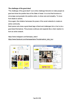 The challenge of the good deed “The challenge of the good deed” is an online challenge that aims to make people do good and show the positive face of the State of Israel. It is a tool that functions to encourage young people into positive action, to show care and empathy. To move from ideals to actions. Once again, this initiative harnesses the power of the social networks to create an active community. Each person who does a good deed tags a friend and challenges him or her to do a good deed themselves. This process continues and expands like a chain reaction to form an entire network. https://www.instagram.com/hamaase_hatov/ https://www.facebook.com/hamaasehatov/?modal=admin_todo_tour Page 35 of 58