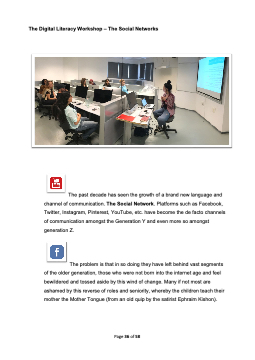 The Digital Literacy Workshop – The Social Networks The past decade has seen the growth of a brand new language and channel of communication. The Social Network. Platforms such as Facebook, Twitter, Instagram, Pinterest, YouTube, etc. have become the de facto channels of communication amongst the Generation Y and even more so amongst generation Z. The problem is that in so doing they have left behind vast segments of the older generation, those who were not born into the internet age and feel bewildered and tossed aside by this wind of change. Many if not most are ashamed by this reverse of roles and seniority, whereby the children teach their mother the Mother Tongue (from an old quip by the satirist Ephraim Kishon). Page 36 of 58