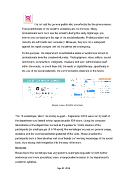 It is not just the general public who are affected by this phenomenon. Even practitioners of the creative industries are not immune. Many professionals were born into the industry during the early digital age, pre internet and certainly pre the age of the social networks. Professionalism and maturity are admirable and necessary. However, they are not a safeguard against the rapid changes that the industries are undergoing. To this purpose, the department established a series of workshops aimed at professionals from the creative industries. Photographers, video editors, sound technicians, scriptwriters, designers, creatives and even administrative staff within the media, to orient them into the world of digital literacy, specifically in the use of the social networks, the communication channels of the future. Sample screens from the workshops The 18 workshops, which ran during August – September 2019, were run by staff of the department and lasted in total approximately 100 hours. Using the computer laboratories of the department as well as the personal mobile devices of the participants (in small groups of 5-10 each), the workshops focused on general usage, statistics and the commercialization potential of the tools. These enabled the participants both a theoretical as well as a “hands on” working knowledge of the social tools, thus easing their integration into the new millennium. Outcome Response to the workshops was very positive, leading to requests for both further workshops and more specialized ones, even possible inclusion in the department's academic syllabus. Page 37 of 58