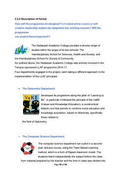 2.2.4 Description of format How will the programme be designed? Is it stand-alone course or will creative leadership subject be integrated into existing courses? Will the programme use project-based approach? The Hadassah Academic College provides a diverse range of studies within the scope of its two schools: The Interdisciplinary School for Sciences, Health and Society, and the Interdisciplinary School for Society & Community. As outlined above, the Hadassah Academic College was actively involved in the Tempus sponsored LLAF programme 2014-17. Four departments engaged in the project, each taking a different approach to the implementation of the LLAF principles: • The Optometry Department Developed its programme along the pillar of “Learning to Be”. In particular it followed the principle of the VaKE (Values and Knowledge Education), a constructivist didactic tool that permits to combine moral education and knowledge acquisition, based on dilemmas, specifically those related to the field of Optometry. The Computer Science Department The computer science department ran a pilot in a second- year calculus course, using the Team Based Learning method, which is a form of flipped classroom model. The students learnt independently the subject before the class from material prepared by the teacher and the time in class was divided into • Page 40 of 58