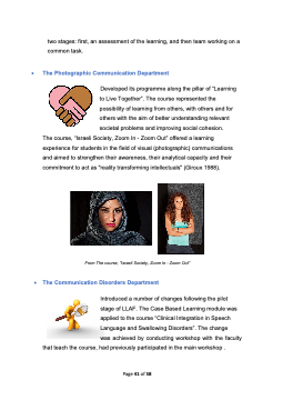 • two stages: first, an assessment of the learning, and then team working on a common task. The Photographic Communication Department Developed its programme along the pillar of “Learning to Live Together”. The course represented the possibility of learning from others, with others and for others with the aim of better understanding relevant societal problems and improving social cohesion. The course, “Israeli Society, Zoom In - Zoom Out” offered a learning experience for students in the field of visual (photographic) communications and aimed to strengthen their awareness, their analytical capacity and their commitment to act as "reality transforming intellectuals" (Giroux 1988). From The course, “Israeli Society, Zoom In - Zoom Out” The Communication Disorders Department Introduced a number of changes following the pilot stage of LLAF. The Case Based Learning module was applied to the course “Clinical Integration in Speech Language and Swallowing Disorders”. The change was achieved by conducting workshop with the faculty that teach the course, had previously participated in the main workshop . • Page 41 of 58