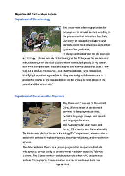Departmental Partnerships include: Department of Biotechnology “I always connected with the life sciences and biology. I chose to study biotechnology at the College as the courses and instruction focus on practical studies which contributed greatly to my career, both while completing my Master’s degree and in my professional work. I now work as a product manager at Teva Pharmaceuticals. Teva focuses on identifying innovative approaches to diagnose malignant diseases and to predict the course of the disease based on the unique genetic profile of the patient and the tumor cells.” Department of Communication Disorders The Claire and Emanuel G. Rosenblatt Clinic offers a range of assessment services for language disabilities, pediatric language delays, and speech and language disorders. The Audiology/ENT (ear, nose, and throat) Clinic works in collaboration with The Hadassah Medical Center’s Audiology/ENT department, where students assist with administering hearing tests, hearing evaluations, and rehabilitation services. The Adler Aphasia Center is a unique program that supports individuals with aphasia, whose ability to access words has been impacted following a stroke. The Center works in collaboration with other HAC departments such as Photographic Communication in order to teach members new The department offers opportunities for employment in several sectors including in the pharmaceutical industries; hospitals, university, or research institutions; and agriculture and food industries. As testified by one of the graduates, Page 48 of 58
