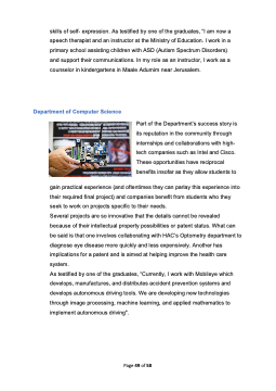 skills of self- expression. As testified by one of the graduates, “I am now a speech therapist and an instructor at the Ministry of Education. I work in a primary school assisting children with ASD (Autism Spectrum Disorders) and support their communications. In my role as an instructor, I work as a counselor in kindergartens in Maale Adumim near Jerusalem. Department of Computer Science Part of the Department’s success story is its reputation in the community through internships and collaborations with high- tech companies such as Intel and Cisco. These opportunities have reciprocal benefits insofar as they allow students to gain practical experience (and oftentimes they can parlay this experience into their required final project) and companies benefit from students who they seek to work on projects specific to their needs. Several projects are so innovative that the details cannot be revealed because of their intellectual property possibilities or patent status. What can be said is that one involves collaborating with HAC’s Optometry department to diagnose eye disease more quickly and less expensively. Another has implications for a patent and is aimed at helping improve the health care system. As testified by one of the graduates, “Currently, I work with Mobileye which develops, manufactures, and distributes accident prevention systems and develops autonomous driving tools. We are developing new technologies through image processing, machine learning, and applied mathematics to implement autonomous driving". Page 49 of 58