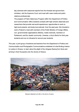 day seminars with seasoned experts from the Knesset and government ministers; visit the Supreme Court; and meet with news media and public relations professionals. The program of Public Diplomacy Program within the Department of Politics and Communication offers students contacts with high echelon diplomats and researchers that provide real world experiences; opportunities to work on high-level projects; and study tours abroad. Over the past year, this included a visit to Poland to meet with members of the Polish Ministry of Foreign Affairs, non- governmental organizations (NGOs), media channels, members of Parliament, and the Jewish community. Likewise, a trip to Berlin for third year students and one to Lithuania for second year students. This year, a joint group of students and teachers from the Department of Politics and Communication and Photographic Communications embarked of a fact-finding mission to Lesbos in Greece, to learn about the plight of the refugees fleeing from Syria and arriving in their thousands onto the shores of Greece. Refugee Lifejackets and rafts on the shores of Lesbos Page 53 of 58