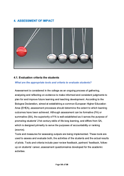 4. ASSESSMENT OF IMPACT 4.1. Evaluation criteria the students What are the appropriate tools and criteria to evaluate students? Assessment is considered in the college as an ongoing process of gathering, analysing and reflecting on evidence to make informed and consistent judgments to plan for and improve future learning and teaching development. According to the Bologna Declaration, aimed at establishing a common European Higher Education Area (EHEA), assessment processes should determine the extent to which learning outcomes have been achieved. Although assessment can be formative (FA) or summative (SA), the superiority of FA is well-established as it serves the purpose of promoting students' 21st century skills of life-long learning, and differs from SA, which is designed primarily to serve the purposes of accountability or ranking (source). Tools and measures for assessing outputs are being implemented. These tools are used to assess and evaluate both, the activities of the students and the actual results of pilots. Tools and criteria include peer review feedback, partners’ feedback, follow- up on students’ career, assessment questionnaires developed for the academic activities. Page 54 of 58