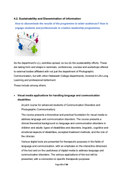 4.2. Sustainability and Dissemination of information How to disseminate the results of the programme to wider audiences? How to engage students and professionals to creative leadership programmes. As the department’s LLL activities spread, so too do the sustainability efforts. These are taking form and shape in seminars, conferences, courses and workshops offered to external bodies affiliated with not just the department of Photographic Communication, but with other Hadassah College departments, involved in Life Long Learning and professional betterment. These include among others: • Visual media applications for handling language and communication disabilities (A joint course for advanced students of Communication Disorders and Photographic Communication) The course presents a theoretical and practical foundation for visual media to address language and communication disorders. The course presents a clinical theoretical background on language and communication disorders in children and adults: types of disabilities and disorders, linguistic, cognitive and emotional aspects of disabilities, accepted treatment methods, and the role of the clinician. Various digital tools are presented for therapeutic purposes in the fields of language and communication, with an emphasis on the interactive dimension of the tool and on the usefulness of digital media to address language and communication disorders. The various applications of the tool will be presented, with a connection to specific therapeutic purposes. Page 55 of 58