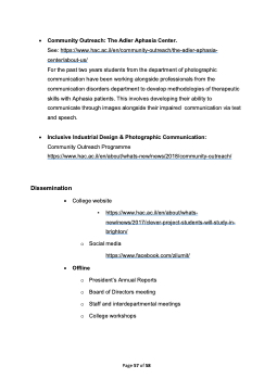 • Community Outreach: The Adler Aphasia Center. See: https://www.hac.ac.il/en/community-outreach/the-adler-aphasia- center/about-us/ For the past two years students from the department of photographic communication have been working alongside professionals from the communication disorders department to develop methodologies of therapeutic skills with Aphasia patients. This involves developing their ability to communicate through images alongside their impaired communication via text and speech. • Inclusive Industrial Design & Photographic Communication: Community Outreach Programme https://www.hac.ac.il/en/about/whats-new/news/2018/community-outreach/ Dissemination • College website ▪ https://www.hac.ac.il/en/about/whats- new/news/2017/clever-project-students-will-study-in- brighton/ o Social media https://www.facebook.com/zilumit/ • Offline o President’s Annual Reports o Board of Directors meeting o Staff and interdepartmental meetings o College workshops Page 57 of 58