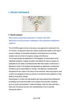 1. PROJECT RATIONALE 1.1 Needs analysis Why creative leadership programme is needed in the HEI? What kind of socio-economic challenges is the programme designed to address? The CLEVER program strives to develop a new approach to teaching for the 21st century. An approach where the creative professional needs to both span a diverse multitude of interrelated disciplines and furthermore to use these creative tools as a force for progress, change and influence. For the past decade the department of Photographic Communication at the Hadassah Academic College Jerusalem has defined its vision to prepare its graduates for the reality of professional life after their studies. Furthermore, it attempts to infuse in its students and graduates an awareness of leadership, excellence and a responsibility for change. This approach manifests itself throughout the four years in the nature of the exercises, tasks and projects, each of which are designed to build up a blend of commitment and confidence in their ability to bring about change. Nevertheless, it is often true that students who have gained their professional knowledge and honed their skills in the creative communication industries, such as visual communication, media and design, enter the real world with a basic lack of business acumen and understanding of how to promote themselves within it. Page 5 of 58