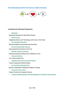The Interdisciplinary School for Sciences, Health and Society Comprising the following Programmes: • Optometry Optometry Education for Real World Careers • Biotechnology Integrating Science and Technology, with a Eye on the Future • Communication Disorders Help the Disabled Communicate with the World • Environmental Quality Sciences Improving the Environment for All of Us • Medical Laboratory Sciences Practical Laboratory Studies and a Profession for Life • Computer Science Your Ticket to High Tech • Optometry and Vision Sciences M.Optom. Tools for Advanced Clinical Practice • Communication Disorders M.A. Become a Specialist in Multicultural Speech Therapy • Computer Science M.Sc. Venture Further into Computer Science • Inclusive Industrial Design, the DAN Department of Creative Human Design Page 7 of 58
