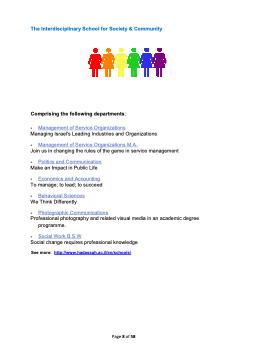 The Interdisciplinary School for Society & Community Comprising the following departments: • Management of Service Organizations Managing Israel's Leading Industries and Organizations • Management of Service Organizations M.A. Join us in changing the rules of the game in service management • Politics and Communication Make an Impact in Public Life • Economics and Accounting To manage; to lead; to succeed • Behavioral Sciences We Think Differently • Photographic Communications Professional photography and related visual media in an academic degree programme. • Social Work B.S.W Social change requires professional knowledge See more: http://www.hadassah.ac.il/en/schools/ Page 8 of 58